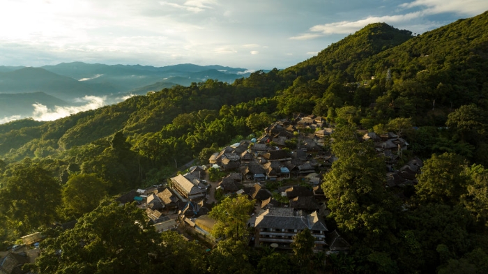 景迈山是云南普洱茶区最具标志意义的一座古茶山,其古茶林是世界上保存完整、面积较大、种植历史悠久的人工栽培古茶林典型代表。2013年以来,当地陆续实施村寨文物保护展示、消防防雷及古茶林监测项目,优先采用传统工艺、传统材料,延续传统干栏式民居建筑结构、特征和风貌,并进行适应性改造和性能提升,在保护传承遗产真实性、完整性的同时,推动遗产保护成果惠及当地群众。2023年9月,“普洱景迈山古茶林文化景观”被列入《世界遗产名录》,成为全球首个茶主题世界文化遗产。这是被山林与茶园环绕的云南景迈山翁基古寨一景(无人机照片,2023年9月18日摄)。