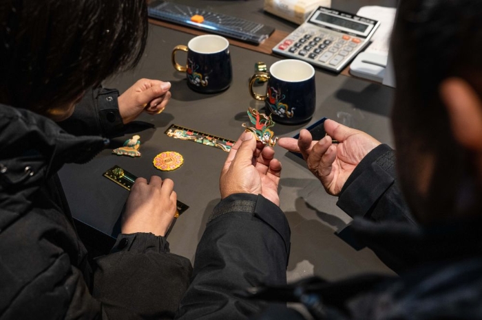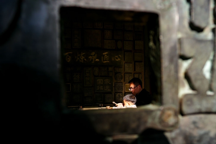 2026年3月25日,在云南曲靖会泽县国家级非遗斑铜制作技艺传习馆,张氏斑铜第十三代传人张伟在教儿子敲打铜器。会泽以“保护优先、匠心修复、多元活化、融合共生”为路径推进古城活化保护,对会馆、民居等古建筑匠心修缮、活化利用,同时保留居民生活业态,常态开展特色文化活动,用微改造提升古城环境。