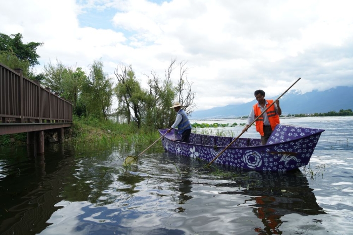 大理市湾桥镇古生村位于洱海边,是一个典型的白族传统村落,已有1000多年历史。近年来,当地抓紧抓实洱海生态治理,古生村也因此受益,游客数量逐渐增加,当地村民持续增收。这是2020年9月14日,村民在大理市湾桥镇古生村水域清理水草。