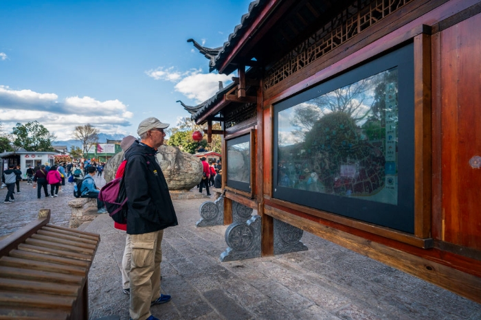 2024年3月23日,游客在丽江古城内查看电子导览大屏。云南省丽江市近年充分应用5G、物联网、大数据、人工智能等数字化技术,大力推动智慧旅游发展,提升服务水平和游玩体验,为当地文旅产业发展注入新活力。