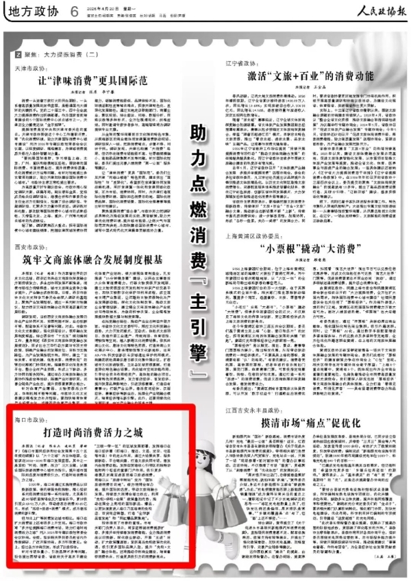 今天(4月20日)出版的人民政协报第6版刊发文章《海口市政协:打造时尚消费活力之城(聚焦:大力提振消费)》。全文如下↓↓↓