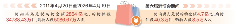 2011年4月20日,海南离岛免税政策正式落地实施。海口海关4月20日发布数据显示,2011年4月20日至2026年4月19日,15年来,海口海关累计监管海南离岛免税购物金额2864亿元,购物件数34788.43万件,购物人数5086.67万人次。