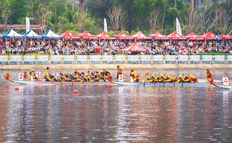 4月20日,2026年“海南三月三·山海同心圆”东方主会场重点活动——“活力东方”龙舟公开赛在东方市北黎河激情开赛,为海南“三月三”活动增添了浓厚的竞技氛围。赛事吸引了全省12支队伍同场竞技。记者 李天平 摄