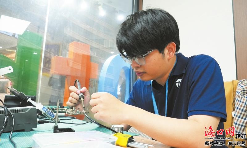 4月20日,在位于美兰区的海南飞行者科技有限公司内,工作人员正在维修设备。记者 杨忠凯 摄