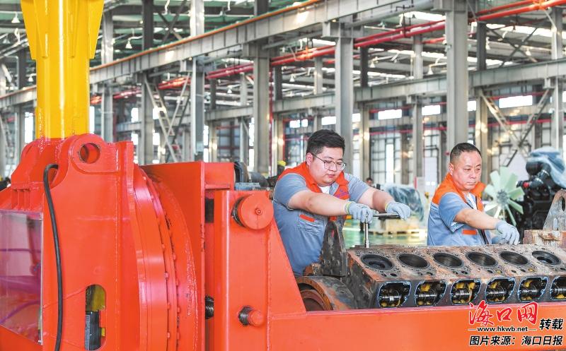 在海口综保区的中车国际车辆产业(海南)有限公司生产车间内,工人维修来自境外的矿卡柴油发动机。记者 康登淋 摄