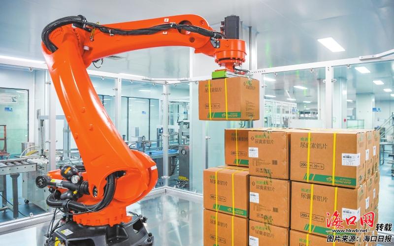 在海南先声药业海口药谷生产基地内,巨臂机器人将装箱完毕的药品码放整齐。记者 康登淋 摄