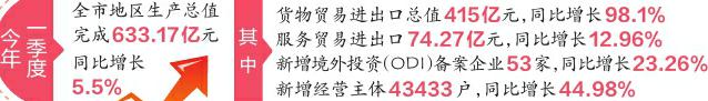 一季度,全市农业总产值37.8亿元,同比增长4.1%;规上工业增加值同比增长10.6%;服务业(第三产业)增加值同比增长5.5%,较2025年全年提高0.6个百分点,对全市GDP增长贡献率高达85%。