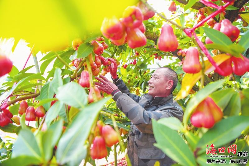 4月19日,琼山区云龙镇云蛟村的莲雾种植园内,红彤彤的果实挂满枝头,果农陈长雄一边娴熟地修剪树枝,一边热情地招呼前来体验采摘的市民游客,种植园里一派丰收忙碌的景象。