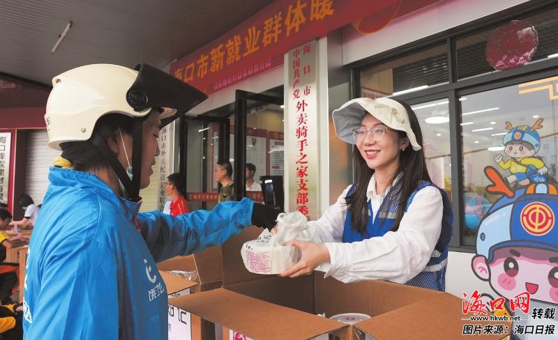 4月23日,在海口市外卖配送企业联合工会骑手之家的暖“新”集市上,外卖骑手正领取免费降暑饮品。记者 杨忠凯 摄