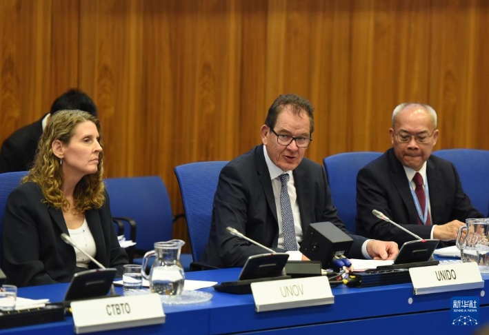 4月28日,在奥地利维也纳,联合国工业发展组织总干事穆勒(中)在全球治理倡议主题活动暨维也纳“全球治理之友小组”启动仪式上致辞。新华社记者贺灿铃摄
