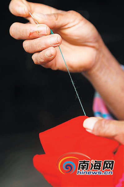 琼中毛阳镇什寒村一名苗族妇女穿针引线做苗绣。苏晓杰 摄