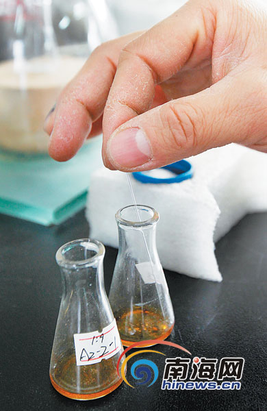 中国热带农业科学院生物研究所的科研人员,正用一只被化学试剂腐蚀脱皮的手继续做着试验。海南日报记者苏晓杰摄