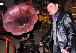 ▲水巷口骑楼老街昨天开街,上个世纪30年代的留声机等古家具在此展销。 本报记者 李汉仁 摄
