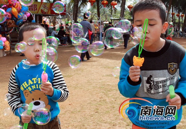 两名小孩在万绿园玩吹泡泡(南海网记者陈望摄)