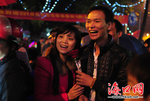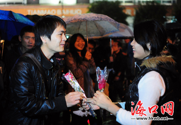 晚上8时许,在琼山区委区政府前,看到一对青年男女正在交换手中的玫瑰花,男子换花成功后并向女孩要了电话号码。四周围满了人群,大家都在看这一对心仪的青年男女并祝福他们。除了结识心仪的异性,通过交换鲜花的方式,互相祝福,也能表达对美好生活的美好祝愿。