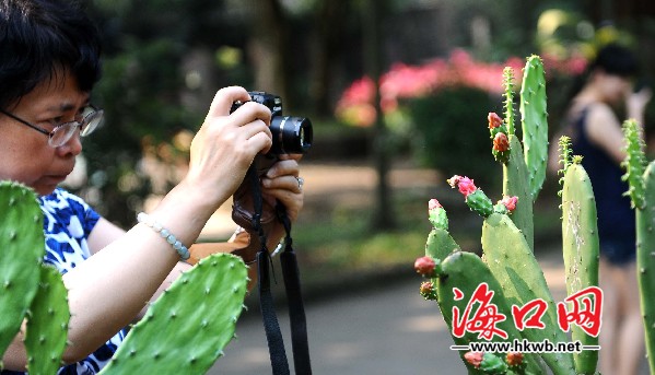 仙人掌开花,吸引一名游客拍照