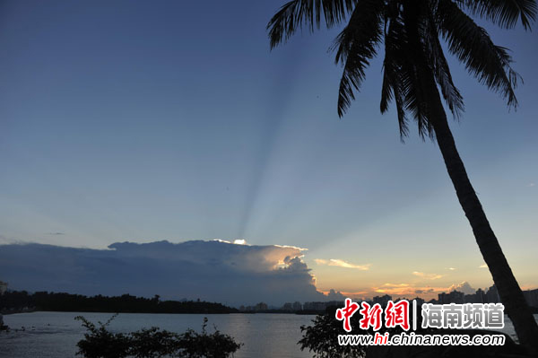 近日,海南持续晴空万里阳光灿烂。6月1日傍晚,高温下的琼海市上空晚霞犹如燃烧的烈焰放射出万丈光芒,将万泉河两岸点缀得分外美丽。图为6月1日,光芒万丈的晚霞将海南万泉河上空点缀得分外美丽。
