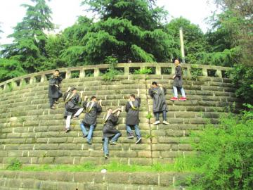 在蒲杰所展示的相册中,12名国旗护卫队的队员一改往日严肃的装容,穿上黑色的学士服在学校的各个地方留影。“蜘蛛侠”爬墙、挂在树枝上、扮成“老佛爷”……各种各样搞怪的造型,展示了大学生们的无限创意。“平日里大家在国旗护卫队的时候都比较严肃,毕业了,我们想留下一些不一样的纪念。”