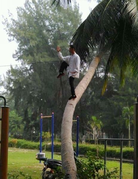 大家还说,这个人好像并非是学校的老师,但是由于其武艺了得,经常在学校内练功,吸引了不少武术爱好者,所以也带了不少徒弟。经常每天上午9点或下午5点左右,他会到第一田径场或学生兴趣协会平房附近的歪脖子椰子树上练功,教徒弟。一上树,他就练个10多分钟,颇为精彩。让人颇为遗憾,27日当天是周日,这位“神人”并没有出现在海大校园内练功,所以记者一时也未能采访到本人。记者将继续跟踪报道此事,为大家一解“神人”真面目。