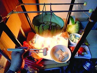 最搞怪的莫过于一个“西瓜皮烧火锅”的创意。图示中,两张椅子被面对面地叠在一起,半个穿了两根线的西瓜皮,就悬空在椅脚中间,下面有蜡烛加热,再加上各种颜色各异的火锅菜色,让人不禁垂涎。图片说明则更让人忍俊不禁:“这货不算违章电器吧?明儿把楼管阿姨叫过来一起吃,呼!好烫”,那些读大学时半夜被饿醒过的网友看过则直呼:“我要和他做舍友”。