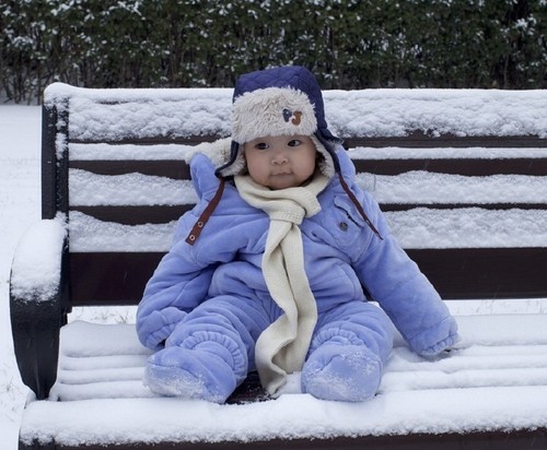 2月7日迎来北京迟来的大雪,姚晨难掩兴奋带儿子出门赏雪,小土豆坐在公园的长椅上萌样十足。