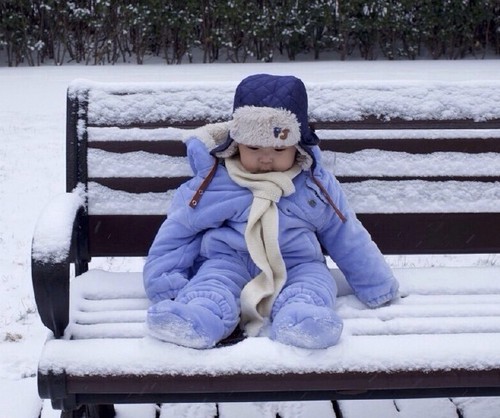 2月7日迎来北京迟来的大雪,姚晨难掩兴奋带儿子出门赏雪,小土豆坐在公园的长椅上萌样十足。