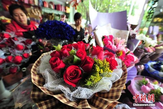2月12日,福州一家花店的工作人员在包装玫瑰花。今年情人节恰逢正月十五元宵节,而因雨雪天气影响,昆明玫瑰种植区受灾严重,直接导致今年情人节玫瑰花价水涨船高。福州花店负责人林女士称,估计到情人节,玫瑰价格最高会涨到每枝40元,较去年同期高出两三倍。中新社发吕明摄