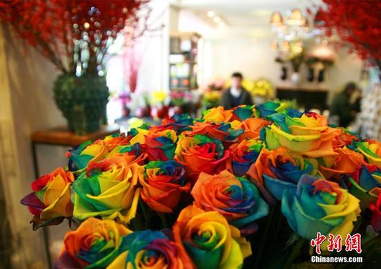 2月11日,浙江杭州中山北路一家高档鲜花门店内的彩虹玫瑰成为今年情人节的明星产品。由于中国鲜花的主产地云南昆明遭遇了几十年罕见的大雪,大面积的花田受冻,产量骤减,杭州市场上玫瑰、百合等节日热卖花卉情人节价格将是平时5倍。中新社发李晨韵摄