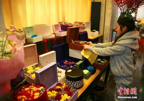 2月11日,浙江杭州中山北路一家高档鲜花门店内,店主正在为即将到来的情人节准备鲜花货源。由于中国鲜花的主产地云南昆明遭遇了几十年罕见的大雪,大面积的花田受冻,产量骤减,杭州市场上玫瑰、百合等节日热卖花卉情人节价格将是平时5倍。中新社发李晨韵摄