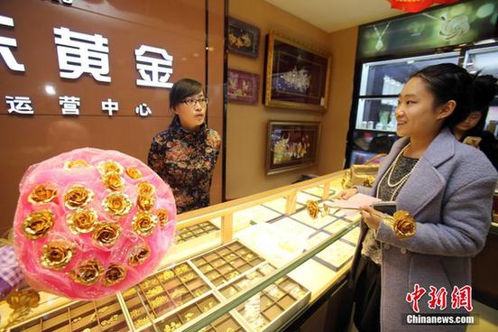 随着一年一度的情人节的来临,又到了玫瑰花销售旺季。某黄金公司推出一款“黄金玫瑰”受到热恋中青年男女的追捧,多家金店的“黄金玫瑰”已经售罄。2月12日,在山西太原一家黄金产品代理商的门店内,金店工作人员前来提取预定的“黄金玫瑰”以应对情人节销售。张云摄