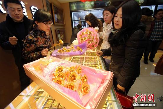 随着一年一度的情人节的来临,又到了玫瑰花销售旺季。某黄金公司推出一款“黄金玫瑰”受到热恋中青年男女的追捧,多家金店的“黄金玫瑰”已经售罄。2月12日,在山西太原一家黄金产品代理商的门店内,金店工作人员前来提取预定的“黄金玫瑰”以应对情人节销售。张云摄