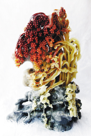 《高粱》利用青田石红、黄、青三种颜色,以娴熟的技艺刻画出高粱挂穗的神韵。远远望去,成熟的高粱粒大饱满,垂下了头,笑弯了腰,在微风中更显诱人般沉醉,连高粱的叶子,也是那般栩栩如生,仿佛在随风摆动身姿。