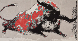 玉良画的牛酣畅淋漓,线条苍劲老辣,深得中国笔墨真谛,尤其是牛角和牛尾,皆以一笔勾勒,如锥划沙,如万岁枯藤,一气呵成,没有书法行草真功,绝难完成。牛的造型写意而夸张,身躯雄伟健壮,充满了雄性的张力和侵略性;而相对的牛的四肢却细小,强烈的对比,让人联想到“英雄气短”———纵有万丈豪情,往往却是时不我予、寸步难行,无奈“揾英雄泪”。