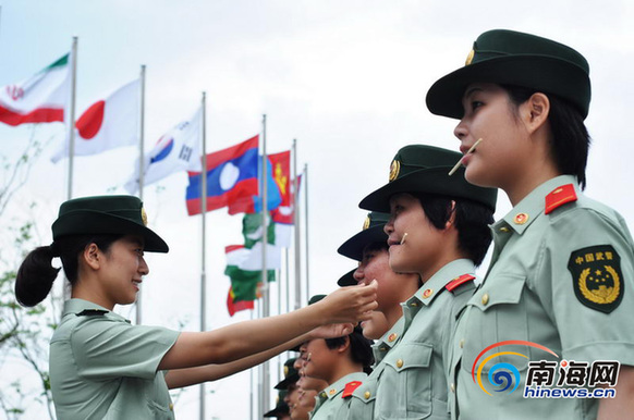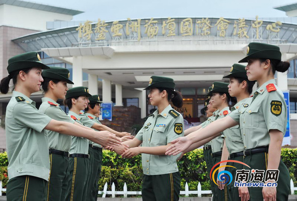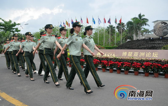 在2014年博鳌亚洲论坛年会警卫勤务中,有一道靓丽的风景线格外引人瞩目,她们是来自武警海南省总队一支队的女警小分队。为圆满完成此次年会安保任务,她们战酷暑、顶烈日,坚持从难从严,刻苦训练,从语言、仪态、举止等各方面提升执勤能力。尽管这十余名女兵首次担负博鳌年会安保任务,但她们信心满满,并将以飒爽英姿、微笑服务向世界各国友人展示中国女兵的形象,以最完善的保护、最周到的服务、最满意的笑容喜迎八方来客。(记者张茂 通讯员 杨瑞明)