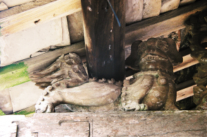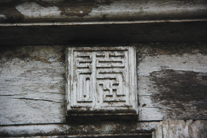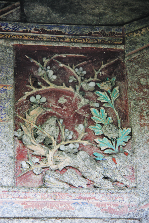 此外,樨头上泥塑并彩绘喜鹊登梅花等花草,南墙楣上泥塑并彩绘两只狮子(取其谐音,寓意事事如意)和兰花等,瓦当上模印阳纹花草和二龙戏珠,都是一些吉祥图案。