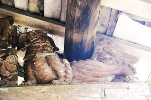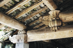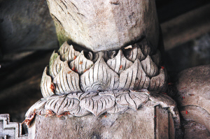 如正屋麻叶状的梁头、瓜形的柱脚、雕刻仰俯荷花的柱顶、前廊鼓腹方形的石柱础上阴刻的仙人纹;门额上方的隔断花纹也简约大方,明间后部的神龛透雕花瓶(寓意平平安安)、鹤、梅花和一羊跪吃奶等内容,雕工细腻。