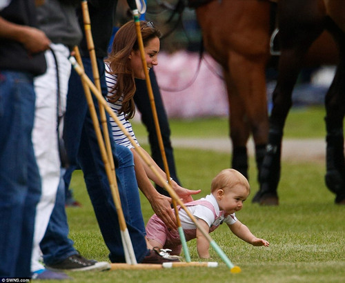 2014年6月15日,英国威廉王子参加了一场慈善马球赛。然而,场下观战小王子乔治似乎对观赏父亲的球技兴趣不大,频频“走神”试图爬走自己玩耍。乔治先是在母亲的怀中“挣扎”,而当凯特将他放下之后,他立刻摇摇晃晃地连走带爬,试图自己一个人玩耍。他还尝试着踢了一只小皮球,甚至抓过一根马球棒,想要学习父亲的技巧。