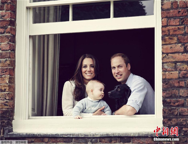2014年3月30日,英国王室在威廉王子夫妇携乔治小王子在访问新西兰和澳大利亚前夕正式对外发表了一张全家照片,这也是8个月大的乔治王子自去年10月接受洗礼之后首次在公开发表的照片上露面。乔治王子在照片上身着淡蓝色套头衫,上面写着自己的名字。他没有像父母那样向前直视镜头,而是微笑着看着爱犬。