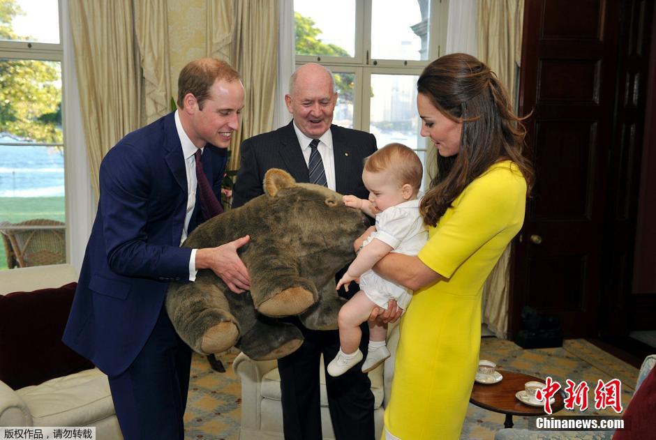 2014年4月16日,澳大利亚悉尼,威廉王子一家抵达悉尼。乔治小王子当天收到澳洲总督 Peter Cosgrove赠送的袋熊玩具。小王子在澳洲的公众活动赚足了眼球,乔治的可爱萌照不仅占据全球各大媒体,连他的背包、衣服都成了超级热销品,数小时之内售罄,“乔治效应”席卷澳洲。