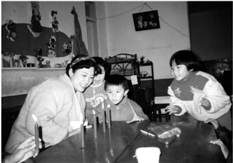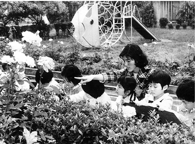 东园新村幼儿园(现东园婴幼园)的孩子们在老师指导下进行户外写生。照片中的老师叫谢敏,作为杭州市第一批示范型幼儿园的老师,他们在学前教育上有许多大胆的探索。