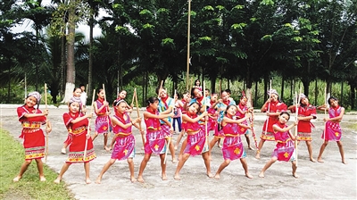 红毛希望小学的学生在进行竹竿舞表演 黎大辉 摄