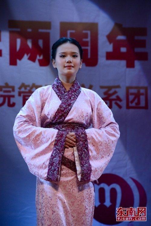东南网报道当平日严肃的大学教师穿上汉服、旗袍、晚礼服,会是怎样一幅场景?在福建师范大学协和学院管理学系2012级入学两周年暨迎新晚会上,8名教师与13名学生共同上演了一场《年代秀》,十多分钟的走秀表演让师生们瞬间从现代穿越回汉朝。