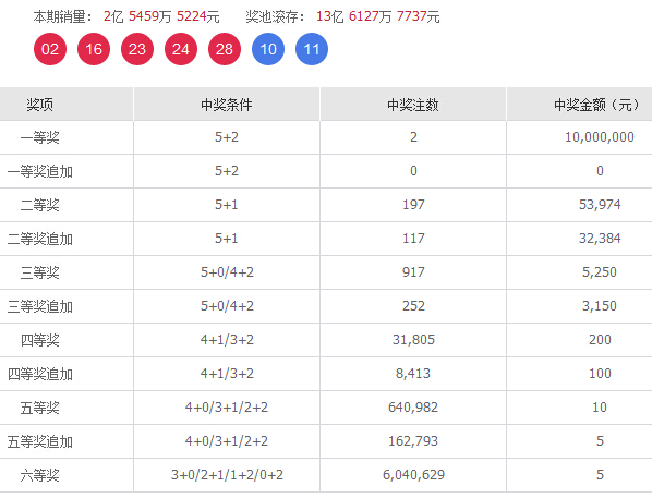 大乐透第14146期开奖号码为:前区:02 16 23 24 28,后区:10 11,前区号码特征为大小比3:2,奇偶比1:4,和值93,跨度26,后区开全大偶奇组合10 11。本期一等奖2注,单注奖金1000万;一等奖追加空开;二等奖开出197注,单注奖金53974元,二等奖追加117注,单注奖金32384元。本期销量254,595,224元,派奖结束后奖池滚存达1,361,277,737元。