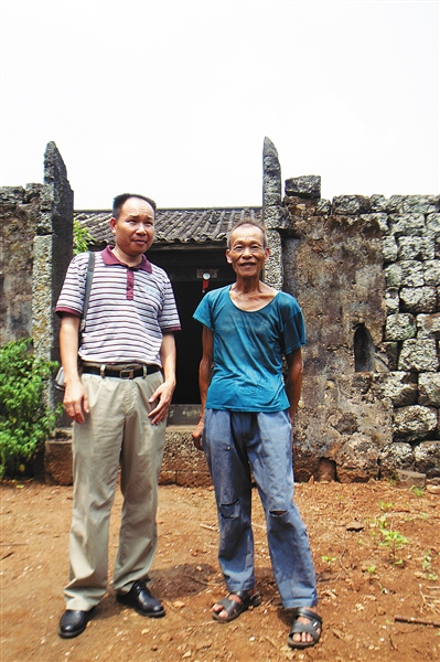 钟捷东(左)在琼北乡村调查乡土文化 陈耿 摄