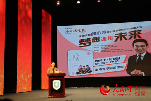 4月13日晚,央视著名主播郎永淳携作品《爱,永纯》在海南大学与学生见面,和学生共同分享他为梦想奋斗的历程,以及与妻子吴萍风雨同舟的感人故事。