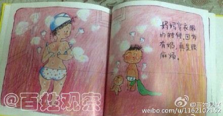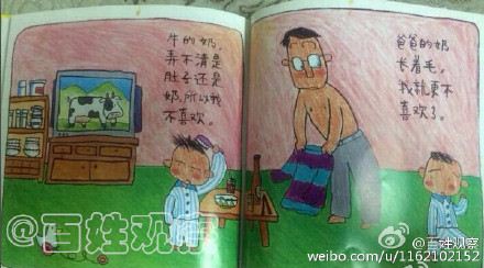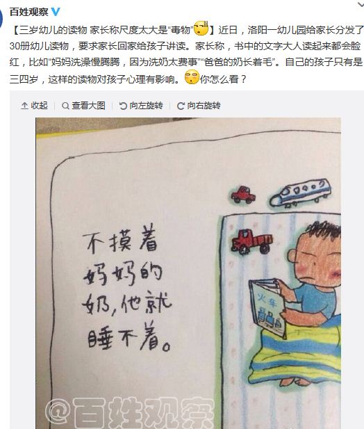 “洛阳一幼儿园给家长分发了30册幼儿读物,要求家长回家给孩子讲读。家长称,书中的文字大人读起来都会脸红,比如‘妈妈洗澡慢腾腾,因为洗奶太费事’、‘爸爸的奶长着毛’。自己的孩子只有三四岁,这样的读物对孩子心理有影响。”近日,一条微博引起了大家关注。