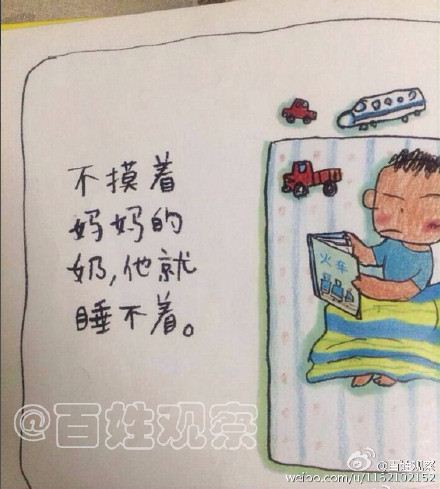 这本叫做《我为什么讨厌吃奶》的日本儿童绘本,以第一人称的方式,讲述了一个小男孩在弟弟出生后,发现大人对他的关注减少,对弟弟有些“妒忌”,以至于出现了讨厌吃奶的情绪。小男孩为不喜欢吃奶准备了一大堆的理由:弟弟没有奶就睡不着,妈妈因为有奶穿衣服也很麻烦……可是,当小男孩撞到头被妈妈搂在怀里时,我们才看清了事实的真相:其实,说不喜欢吃奶,只是因为嫉妒呀!但同时,在一些话的旁白中,插图也确实有对“妈妈”胸部的直白描绘。