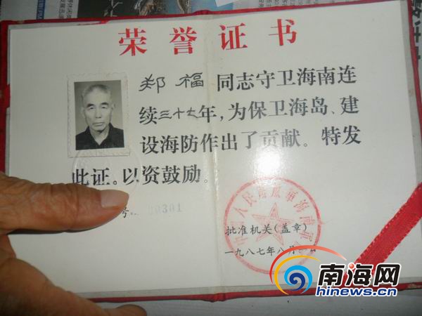 部队颁发给郑福的荣誉证书 孙令正 摄