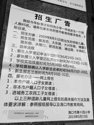 昨日下午,在海口市第十四小学门口,部分学生家长指着学校门口张贴的招生广告告诉记者,海口市第十四小学今年秋季计划招收小学一年级新生一个班,人数45名,并提醒各位家长按要求报名,逾期自误。招生对象为2009年8月31日前出生的学龄儿童。