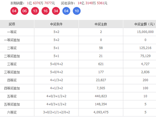 花落福建南平的一等奖是一张"6+2"小复式,投注号码为:"04、06、13、16、23、34 + 04、10";除命中1注一等奖及1注派奖一等奖,还揽得三等奖5注,总奖金1502万元。